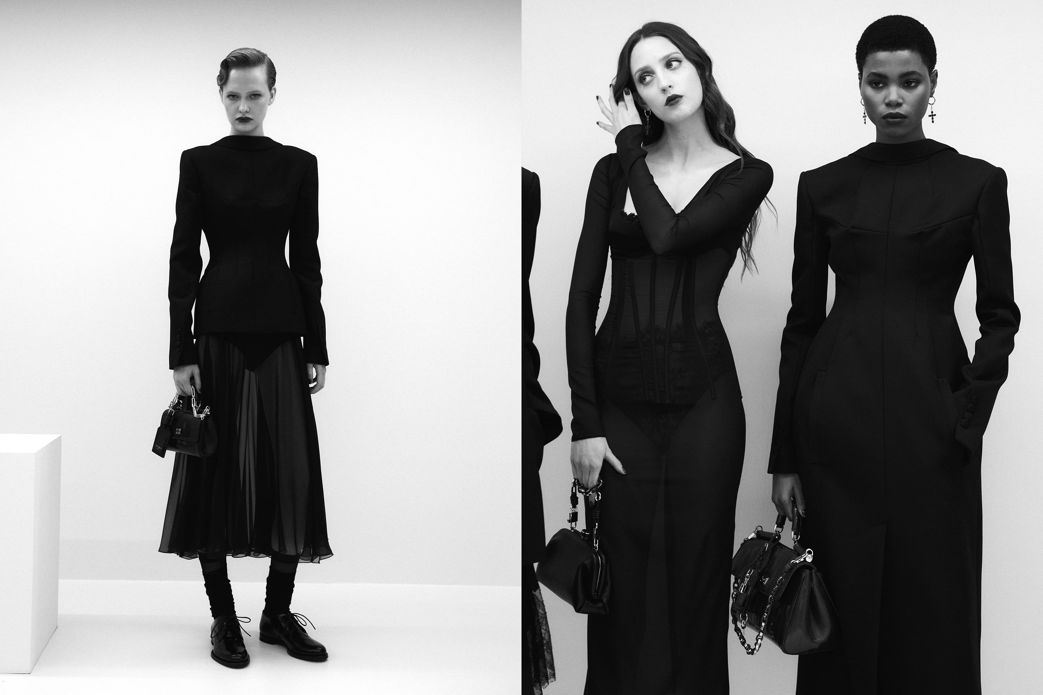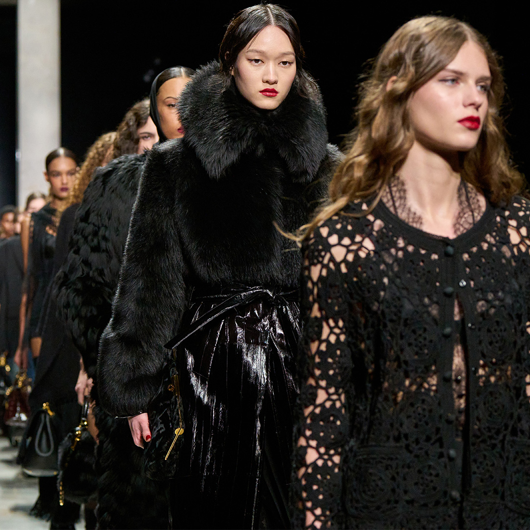 本季大秀聚焦于品牌即刻可辨的标志性风格与归根本源,回溯至西西里岛的古雅意象及其迷人氛围氤氲,以全黑造型、披肩、钩编技艺和清晰致意传统底蕴臻美呈现。蕾丝在本季中作为核心风格元素,承载着设计的传承本源、卓凡慧蕴和精湛匠艺,尽致焕发崭新现代风貌。这款标志性面料勾勒身型轮廓,而透肤效果、朦胧隐现的设计增添灵韵,搭配深开低胸领口,嫣然升华感性、精雅风范。感性如柔纱掩映,以别样视角细腻诠释,对比鲜明、轻柔飘逸的各式面料形塑本季各款叠搭连衣裙与裙装臻作。