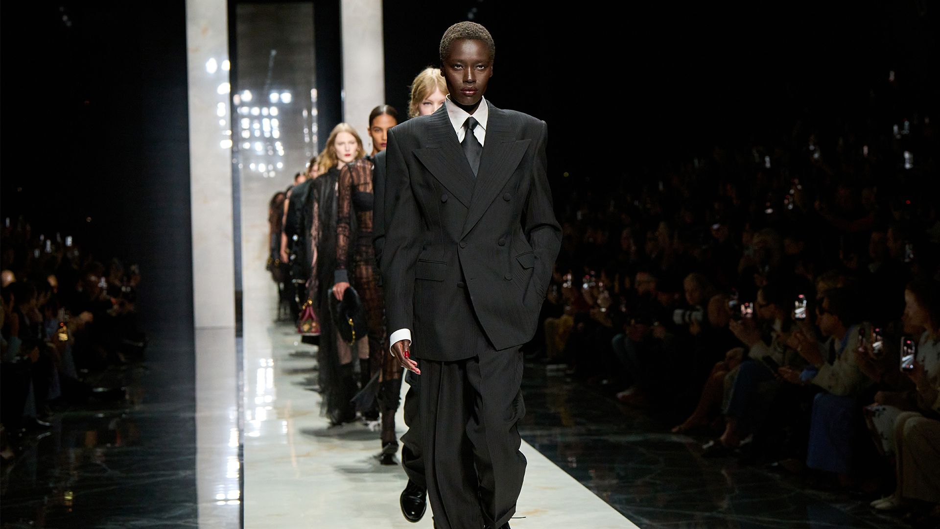2026 秋冬女装秀揭启回溯本源之旅的帷幕,严谨的精裁工艺以精确线条、考究廓形和羊毛细条纹等经典图案再绽风华。正统风格的经典符码与跳脱常规的独特例外构成精妙平衡,于创意巧思中精心呈现:在服装新作的剪裁结构中,双排扣的工艺亮点谐美呼应外套背面的设计,镜像正面布局。成果结晶历经繁复精细的研究、设计和实验,最终淬炼出吸睛夺目的视觉效果。
