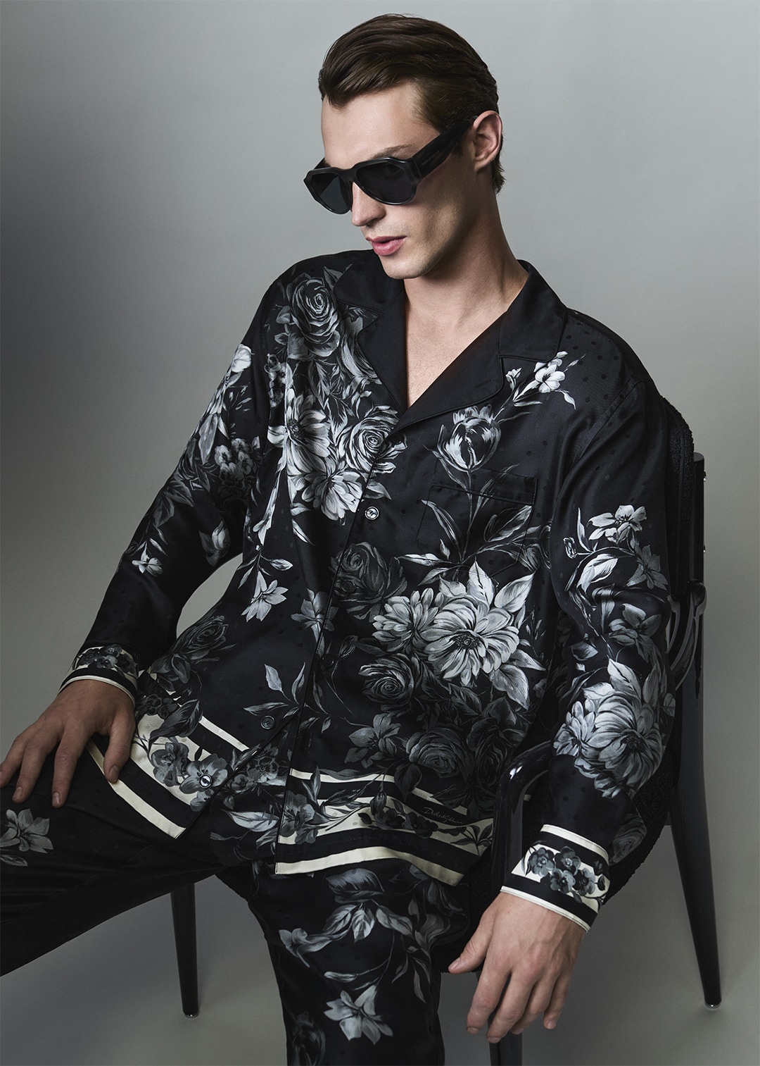 从宽大、挺括到柔和、流畅,严选天鹅绒与丝绸裁制的西装翻领,灵动呈现多重风貌。无论是同色系织物面料与宝石纽扣等别致细节,抑或缀以波点纹样、豹纹印花的绉纱、真丝衬里,均为服装本色增添独特格韵。西装套装的对比拼缝卓然映现永恒绅雅风范的崭新意蕴。