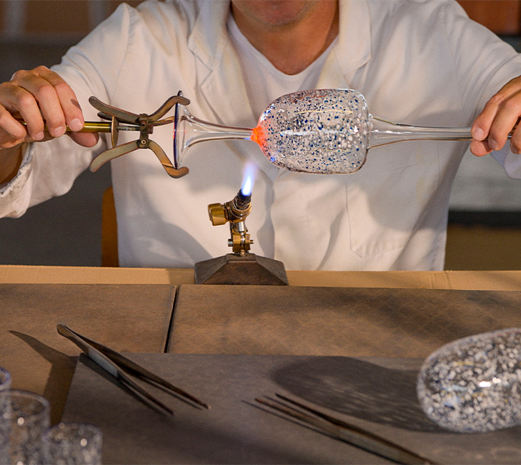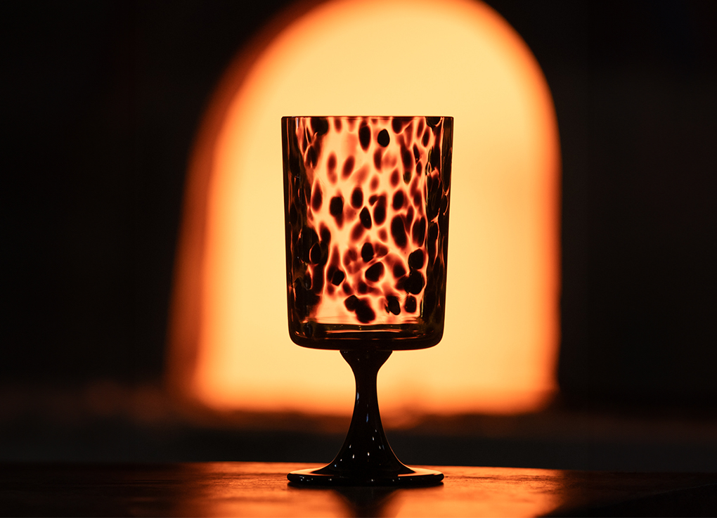 将悉心筛选的 Murano 黑色玻璃细粒轻撒在尚未成型、仍处于温热状态的琥珀色玻璃杯体上,接着,将杯体固定于吹管,如此以来,玻璃细粒便会在旋转的过程中融进杯体表面。