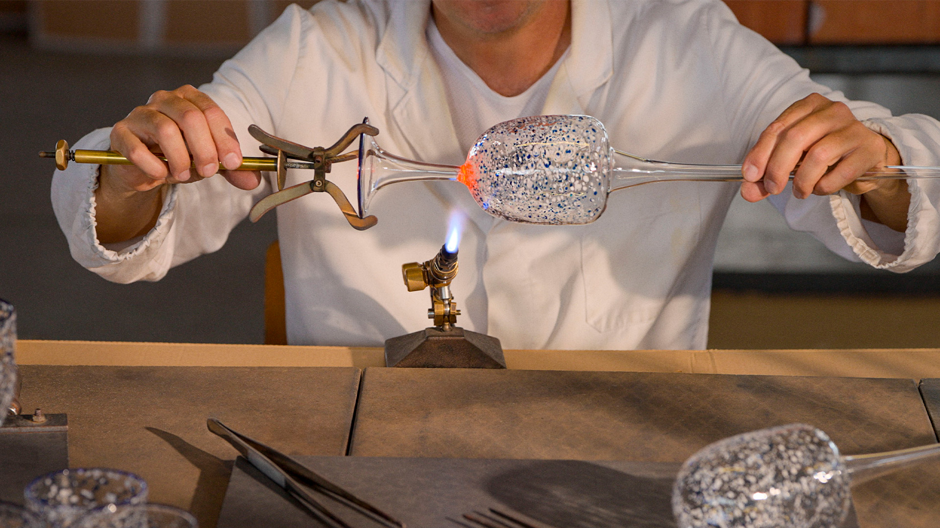 玻璃管状胚体经喷灯加热塑形,接着在匠师的巧手下逐渐蜕变成型,其全程在工作台前亲自把控所有工序。
